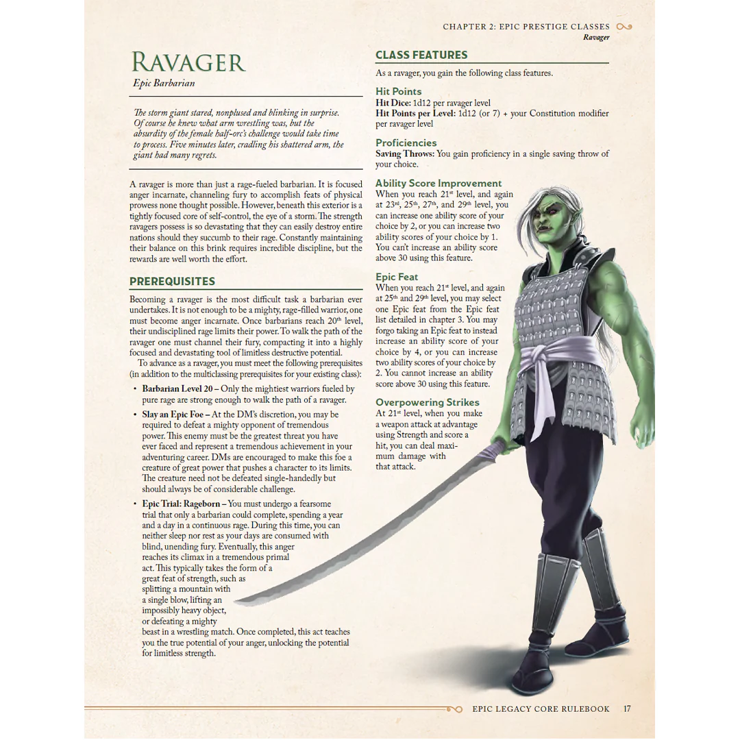 The Epic Legacy Core Rulebook is a 5th Edition supplement which adds a powerful and tested Epic tier to the established levels of play, advancing the Character progression from levels 21 to 30.