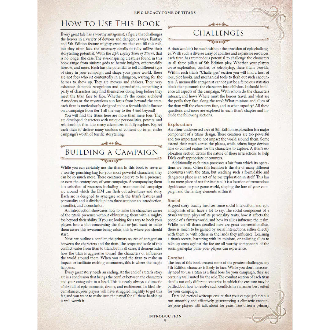 Behind every great 5th Edition campaign lies a great antagonist. The Epic Legacy Tome of Titans exists so your table will never be without the most iconic, powerful, and challenging enemies from fiction, mythology, and RPG lore.
