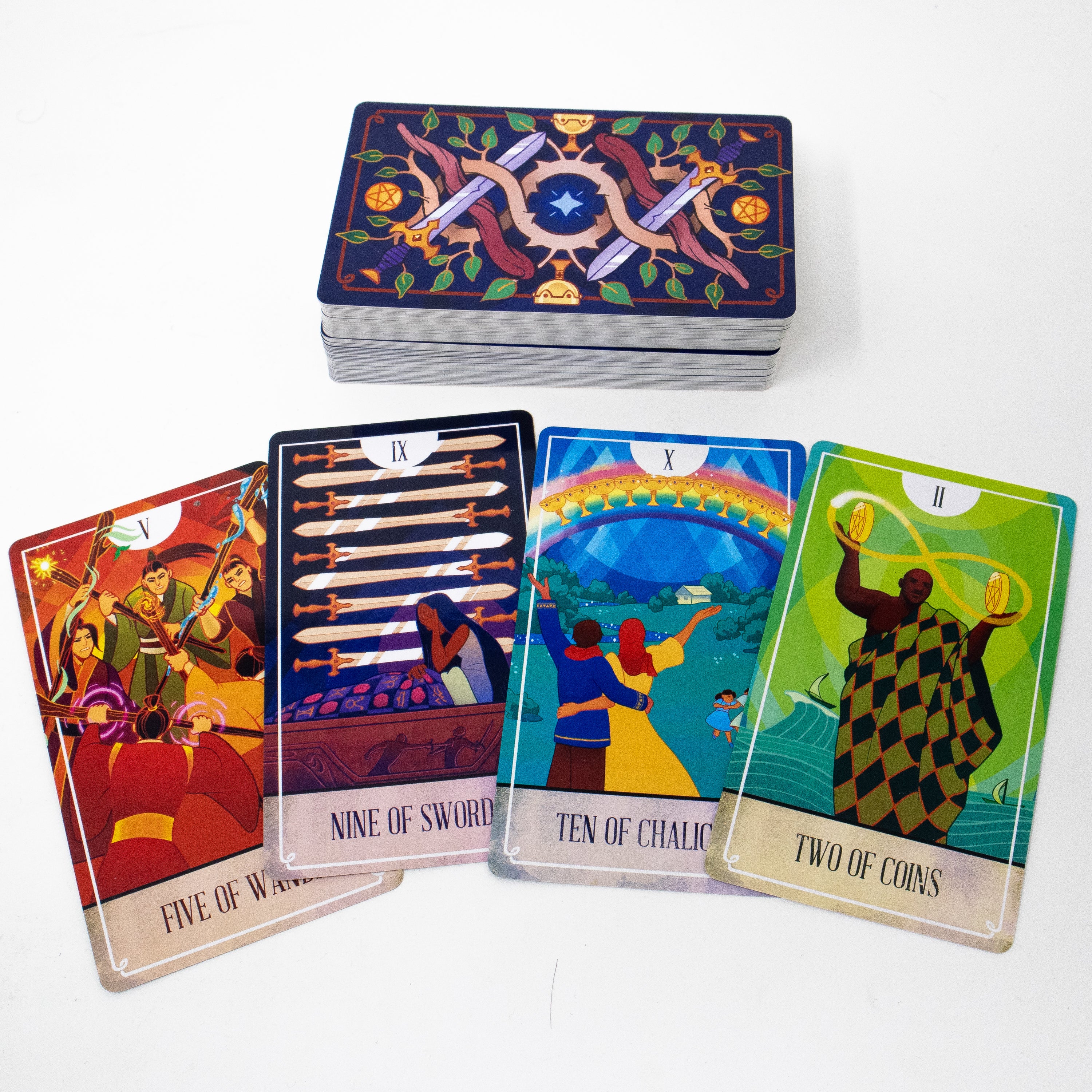 This tarot deck features stunning, brightly-illustrated inclusive artwork inspired by the Rider-Waite tarot deck. It can be used in TTRPGs as well as for divination. The deck includes all Major and Minor Arcana (78 cards in total) along with a simple booklet to guide you through their meanings.